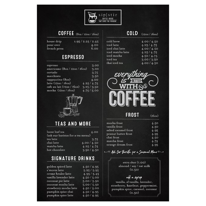 E s p r e s s o espresso americano cortado macchiato cappuccino latte cafe au lait mocha. 95 delivery was on time. Updated more than 6 months ago. Sip coffee house highland menu. As an coffee shop, sip coffee house offers many common menu items you can find at other coffee shops, as well as some unique surprises.